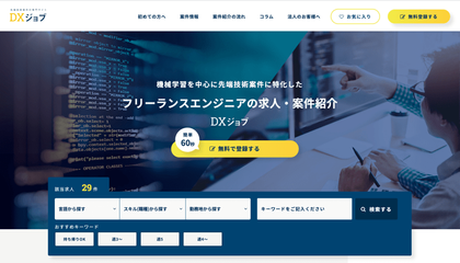DXジョブは、Cliffhanger株式会社が運営する機械学習を中心に先端技術案件に特化したフリーランス求人・案件を紹介しているフリーランスエージェントです。