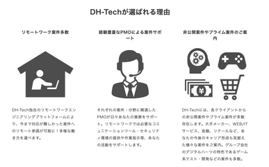 DH-TechはIT・Web系フリーランス求人・案件を取り扱っていること、高単価や非公開、プライム求人・案件を豊富に保有していること、リモート求人・案件を取り扱っていること、フリーランス以外にも正社員、派遣の雇用形態の求人・案件を取り扱っていること、経験豊富なPMOによる案件サポートしてくれることなどの特徴があるフリーランスエージェントです。