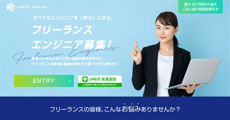 独自求人・案件や直エンド求人・案件など商流の浅いフリーランス求人・案件への参画を希望しているフリーランスエンジニアなどはDIGITAL BLOCKS(デジタルブロックス)の登録をおすすめします。