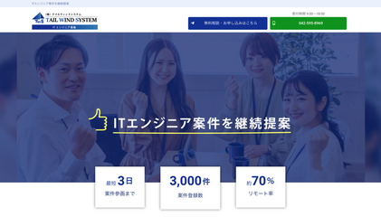 テイルウィンドシステムは、株式会社テイルウィンドシステムが運営するIT/Webに特化したフリーランス求人・案件を取り扱っているフリーランスエージェントです。