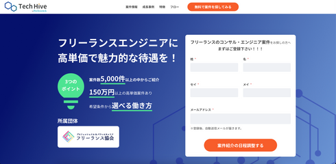 Tech Hiveは、株式会社Asikazeが運営するフリーランスエンジニア向けのフリーランスエージェントです。