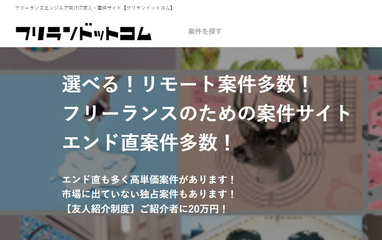 フリランドットコムの保有案件のほとんどがのフルリモート案件なので、地方でも場所を選ばずできる仕事が豊富です。主にリモートでの勤務を希望している、地方に居ながら仕事をこなしたいと考えているフリーランスにおすすめのフリーランスエージェントです。