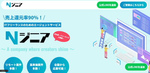 「Nジニア」は、株式会社ネクストクリエーションズが運営する、ITフリーランスエンジニア向けのエージェントサービスです。特徴は、業界トップクラスの売上還元率90%を誇る点で、フリーランスがより高い報酬を得られる仕組みが整っています。全国3,800社以上の企業と取引があり、案件の種類や数も豊富。リモート案件や高単価案件も多数取り扱っており、地方在住者でも応募可能です。案件紹介から面談対策、アサインまでの流れが明確で、公式LINEを通じてスムーズに登録・相談が可能。支払いサイトは月末締め翌月末払いで、安定した収入管理が可能です。技術者の希望やスキルに合わせた案件選定を行うことで、案件定着率も90%以上と高く、安心して長期的に働ける環境が整っています