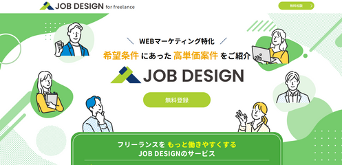 「JOB DESIGN」は、Webマーケティング分野に特化したフリーランス向け案件紹介サービスです。「フリーランスをもっと働きやすくする」をコンセプトに、案件紹介に留まらない手厚いサポートを提供します。