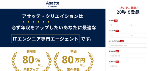 「アサッテ・クリエイション」は、年収アップを目指すITエンジニアに特化したフリーランスエージェントです。