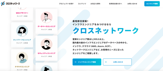 クロスネットワークは、株式会社GIGが運営するインフラエンジニア専門のエージェントサービスです。AWS、Azure、GCPなどのクラウド案件やネットワーク構築、セキュリティ対応などに特化し、1,500人以上の登録エンジニアから最適な人材を最短即日で提案。週2〜3日など柔軟な稼働調整が可能で、コストを抑えた「半内製化」も実現できます。