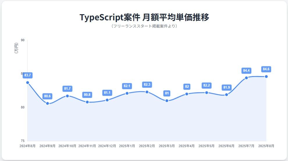 エン・ジャパンが運営する『フリーランススタート』の最新データを基に、2025年7~8月度のTypeScript案件の単価動向を分析しました。